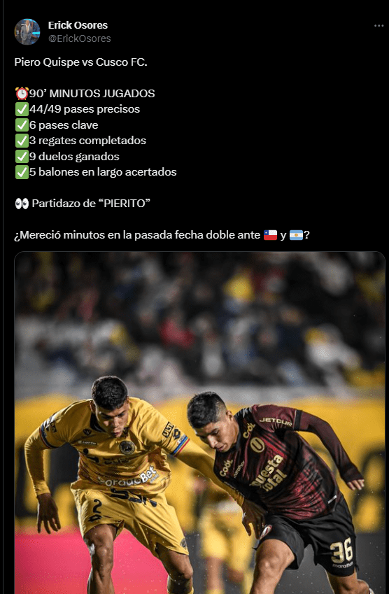 “Piero Quispe vs Cusco FC: 90 minutos jugados, 44/49 pases precisos, 6 pases clave, 3 regates completados, 9 duelos ganados y 5 balones en largo acertados. Partidazo de ´Pierito´. ¿Mereció minutos en la pasada fecha doble ante Chile y Argentina?”; fue la más reciente información con la que el periodista deportivo Erick Osores dio a conocer los números y las estadísticas que arrojó la actuación del volante crema en uno de los partidos en donde más necesitaban de él.