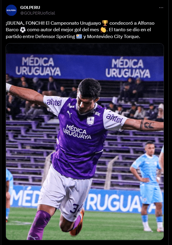 “¡Buena, Fonchi! El Campeonato Uruguayo condecoró a Alfonso Barco como autor del mejor gol del mes. El tanto se dio en el partido entre Defensor Sporting y Montevideo City Torque”; fue la más reciente información con la que ´Gol Perú´ confirmó que el mediocampista está pasando por un estupendo presente y que el golazo marcado hace algunas semanas acaba de ser elegido como el más bravo de todos. En conclusión, los hinchas de la ´U´ nunca supieron aprovecharlo al máximo y ahora les da una lección de que es un gran jugador en el exterior.