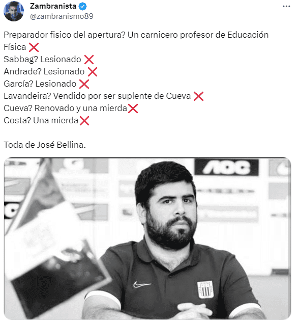 Sino, el máximo responsable fue el que los trajo, José Bellina, quien ha traído una gran cantidad de jugadores que no funcionaron en el equipo, que no rindieron y que se la pasaron lesionados, algo que terminó por perjudicar a Alianza Lima, por lo que ya están pidiendo su cabeza, ya que la realidad es que hoy por hoy, en vez de jugar con un equipo mejor, han ido para atrás, jugando con los mismos y no teniendo oportunidad de mejorar el equipo.