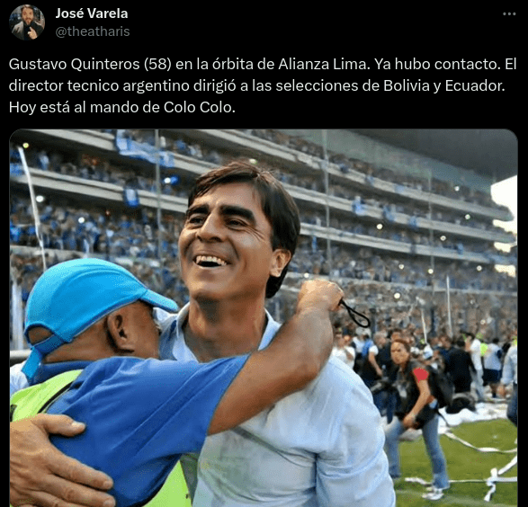Pues se reveló quien podría ser el nuevo DT de Alianza Lima y es Gustavo Quinteros, quien es de los entrenadores más reconocidos de los últimos tiempos. “Gustavo Quinteros (58) en la órbita de Alianza Lima. Ya hubo contacto. El director tecnico argentino dirigió a las selecciones de Bolivia y Ecuador. Hoy está al mando de Colo Colo”, pudo dar a conocer José Varela en sus redes sociales, por lo que es alguien que tendría oportunidad ya que hubo un contacto real.