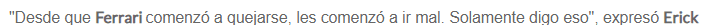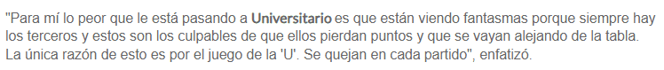 “Desde que Ferrari comenzó a quejarse, les comenzó a ir mal. Solamente digo eso. Para mí lo peor que le está pasando a Universitario es que están viendo fantasmas porque siempre hay terceros y estos son los culpables de que ellos pierdan puntos y que se vayan alejando de la tabla. Se quejan en cada partido”; fue la contundente apreciación del comunicador deportivo en mención vía ´Equipo F´.