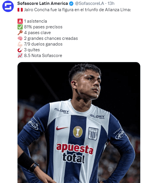 Simplemente Jairo Concha está pasando por un nivel tremendo en el fútbol peruano, marcando la diferencia con el balón en los pies, con lo cual ha llegado hasta ahora a dar un buen espectáculo, así que ante Unión Comercio dio 1 asistencia, tuvo el 81% de precisión de pases, tuvo 4 pases clave, 2 grandes chances creadas, ganó 7 de los 9 duelos que tuvo y aparte, 3 quites, todos estos valores destacados por el medio Sofascore.