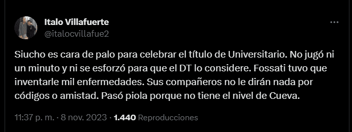 “Siucho es cara de palo para celebrar el título de Universitario. No jugó ni un minuto y ni se esforzó para que el DT lo considere. Fossati tuvo que inventarle mil enfermedades. Sus compañeros no le dirán nada por códigos o amistad. Pasó piola porque no tiene el nivel de Cueva”; fue uno de los comentarios más llamativos que se pueden apreciar en redes sociales respecto al atacante merengue, quien incluso en la final de ayer salió en la lista de convocados.