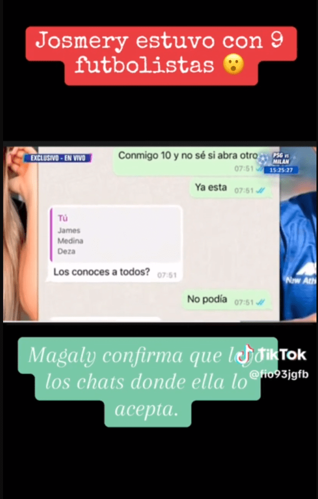 Según el propio ´Caballito´ Hurtado se pudo conocer que James Rodríguez es parte de los jugadores con los que Jossmery Toledo habría tenido una especie de relación o en todo caso se habrían encontrado en diversas oportunidades. Esto se pudo apreciar a través de unos chats que fueron presentados hace algunas horas en el reconocido programa nocturno ´Magaly TV: La Firme´, los cuales ya vienen siendo compartidos a través de las redes sociales y que seguramente incluso ya llegaron a los medios colombianos para empezar a rebotar el suceso.