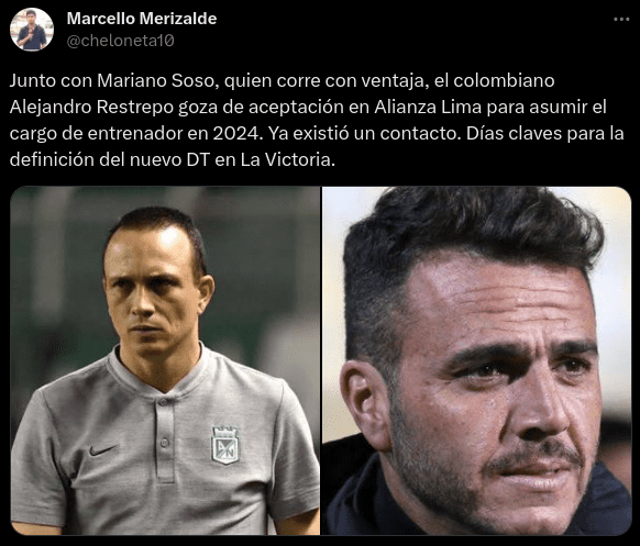 Pero no es el único que llegaría, ya que también se ha conocido que habría una opción para que Alejandro Restrepo pueda llegar a Alianza Lima, el colombiano es bien visto según dio a conocer Marcello Merizalde. “Junto con Mariano Soso, quien corre con ventaja, el colombiano Alejandro Restrepo goza de aceptación en Alianza Lima para asumir el cargo de entrenador en 2024. Ya existió un contacto. Días claves para la definición del nuevo DT en La Victoria”, dio a conocer el comunicador en sus redes sociales.