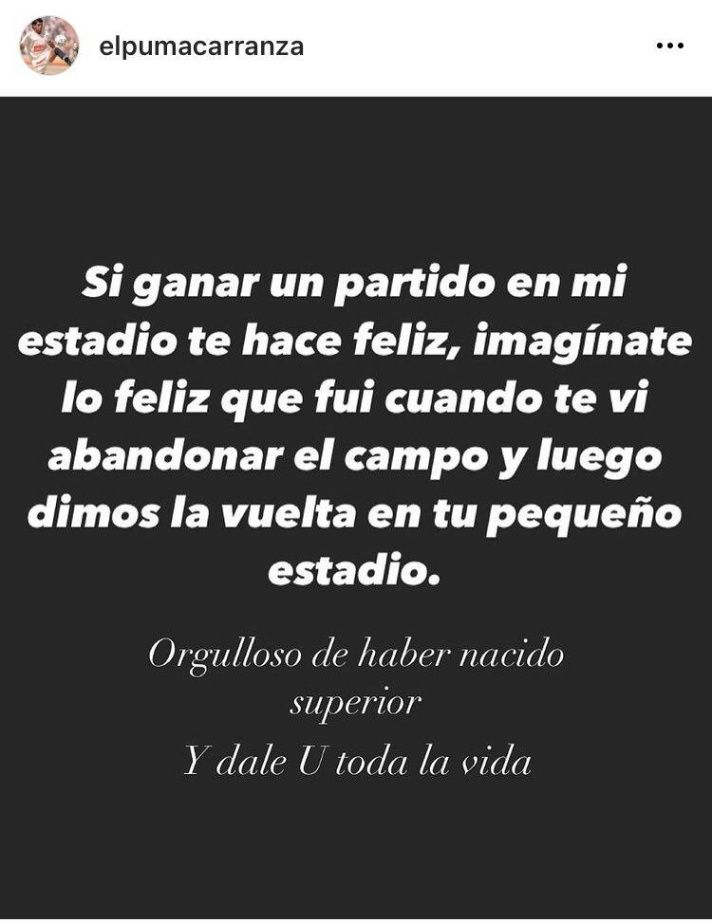 Y es que, José Luís Carranza, más conocido como el ´Puma´ publicó una imagen via redes sociales indicando que ganar un partido no vale lo que hizo Universitario contra Alianza Lima en 1999 y en el 2009: dar la vuelta en su propia cancha.