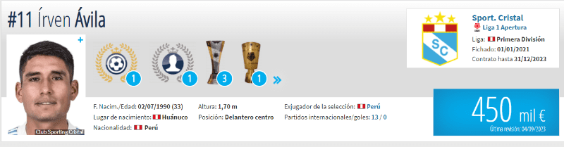 El delantero de 33 años tiene una cotización internacional de 450 mil euros, lo que en soles daría un aproximado arriba de los 1,7 millones, de acuerdo al portal especializado ´Transfermarkt´. Su contrato con Sporting Cristal termina a fines de este año y la verdad es que parece muy complicado que le puedan renovar, aunque con la directiva liderada por Joel Raffo nunca se sabe por las decisiones que han tomado en los últimos años.