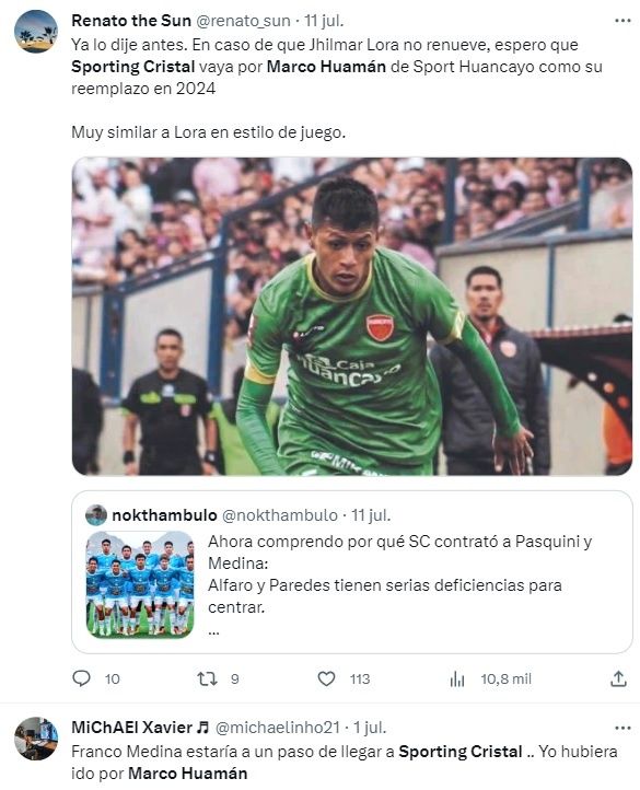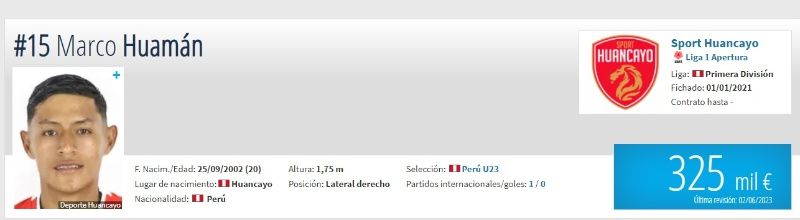Este jugador tiene apenas 20 años y ya está cotizado en el mercado en S/1,2 millones (325 mil euros). Nos referimos a Marco Huamán, lateral derecho de Sport Huancayo. Huamán viene destacando con los colores del ‘Rojo Matador’, en 17 partidos disputados ha convertido un gol y ha aportado con 3 asistencias a lo largo del 2023.