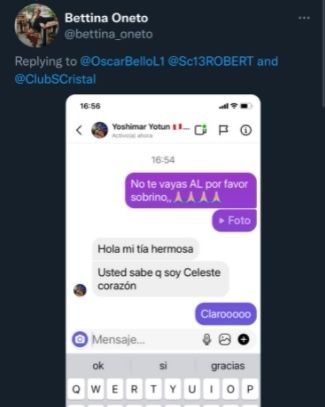 Una de las pruebas más concretas que ha aparecido no salió a la luz en Twitter, sino en Instagram. En una conversación en privado en dicha red social, se aprecia a una persona allegada al volante de la selección peruana llamada Bettina Oneto decirle al jugador que no se vaya a Alianza Lima.