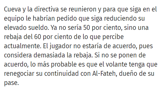 Al Fateh es la otra parte, la cual estaría analizando bien que es lo que puede hacer con Christian Cueva, ya que para ellos es importante venderlo, no lo quieren tener en el club, de igual forma por medio del Trome se conoció que quieren rebajar hasta 1 millón de euros su ficha para encontrar comprador, eso sí, el mediocampista no quiere irse de Alianza Lima en estos momentos.