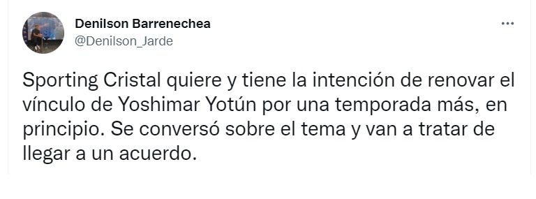Nos referimos a Yoshimar Yotún, el talentoso mediocampista celeste de 32 años ha demostrado su calidad indiscutible no solo en el equipo sino también en la Selección Peruana, motivo por el cual los directivos desde La Florida harían un esfuerzo para que el jugador se queda una temporada más. La información la reveló el periodista Denilson Barrenechea en sus redes sociales: “Sporting Cristal quiere y tiene la intención de renovar el vínculo de Yoshimar Yotún por una temporada más, en principio. Se conversó sobre el tema y van a tratar de llegar a un acuerdo”, precisó.