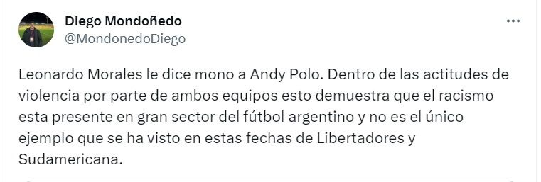 Según el periodista de RPP, Diego Mondoñedo, el futbolista argentino le dijo ‘mono’ al delantero de Universitario. “Leonardo Morales le dice mono a Andy Polo. Dentro de las actitudes de violencia por parte de ambos equipos esto demuestra que el racismo esta presente en gran sector del fútbol argentino y no es el único ejemplo que se ha visto en estas fechas de Libertadores y Sudamericana”, precisó el comunicador en su cuenta de Twitter.