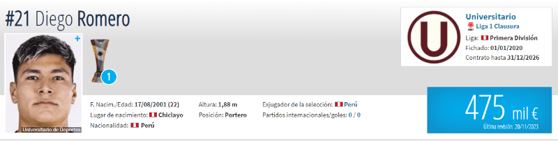 El arquero de 22 años tiene una cotización internacional de 475 mil euros, lo que en soles daría un aproximado arriba de los 1,8 millones, de acuerdo al portal especializado ´Transfermarkt´. Si bien es cierto que con la ida de José Carvallo perdieron experiencia y liderazgo en el vestuario, Universitario de Deportes y la apuesta por Diego Romero podría darles un nuevo aire de juventud y rebeldía en el año de su Centenario.
