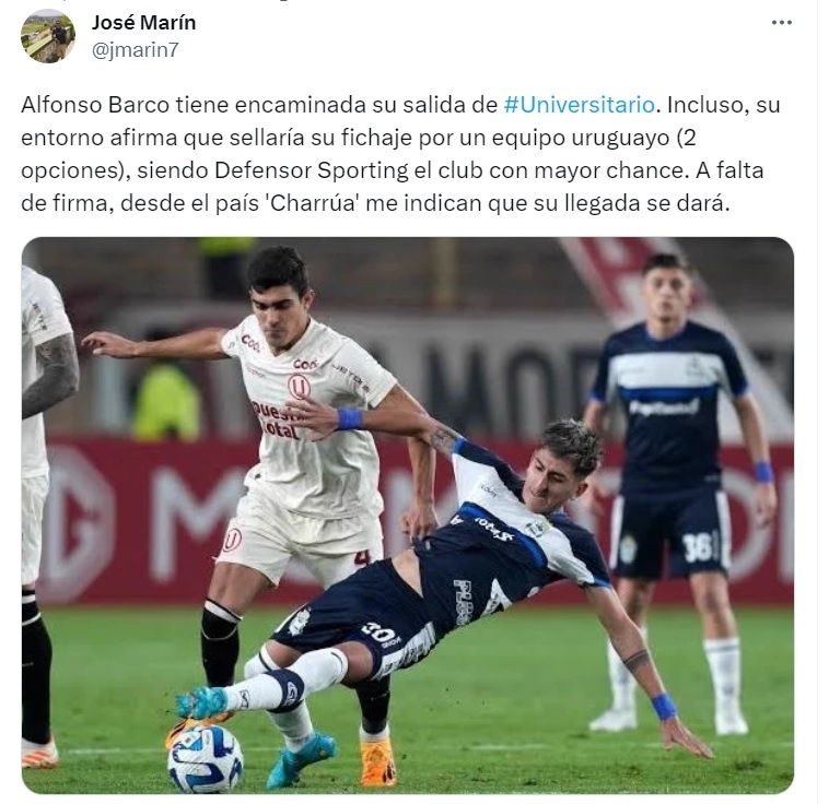 Así lo dio a conocer el periodista José Marín en sus redes sociales. “Alfonso Barco tiene encaminada su salida de Universitario. Incluso, su entorno afirma que sellaría su fichaje por un equipo uruguayo (2 opciones), siendo Defensor Sporting el club con mayor chance. A falta de firma, desde el país 'Charrúa' me indican que su llegada se dará”, reveló el comunicador en sus redes sociales.