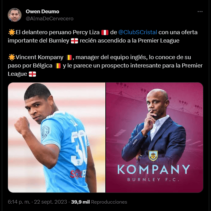 “El delantero peruano Percy Liza de Sporting Cristal con una oferta importante del Burnley recién ascendido a la Premier League. Vincent Kompany, mánager del equipo inglés, lo conoce de su paso por Bélgica y le parece un prospecto interesante para la Premier League”; es la información brindada por la reconocida cuenta de twitter ´Owen Deumo´ que sin duda alguna está generando enorme expectativa en las redes sociales y sobre todo causando las distintas respuestas de los hinchas cerveceros que no tenían presepuestada esta noticia.