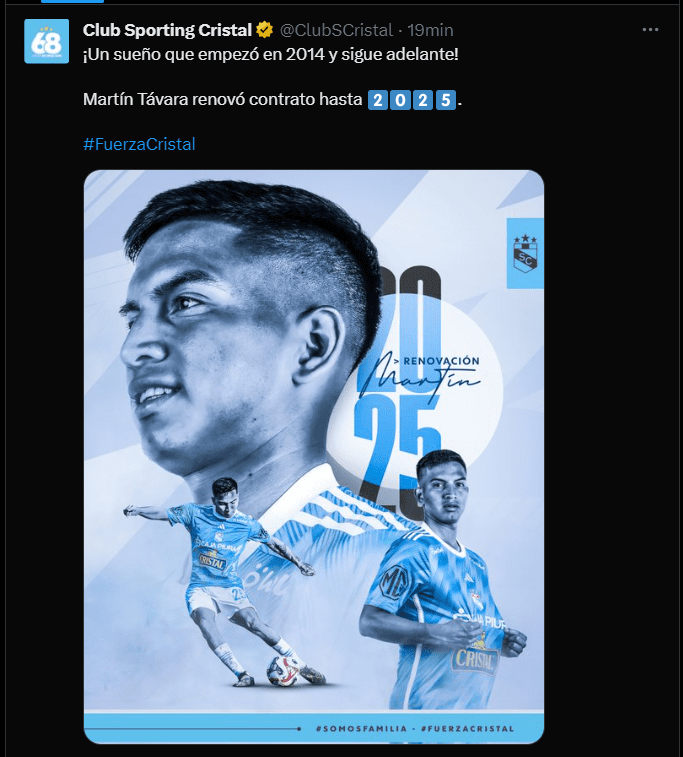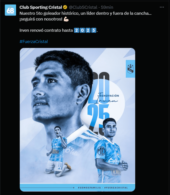 “Nuestro 5to goleador histórico, un líder dentro y fuera de la cancha… ¡seguirá con nosotros! Irven renovó contrato hasta 2025” y “¡Un sueño que empezó en 2014 y sigue adelante! Martín Távara renovó contrato hasta 2025”; fueron las más recientes publicaciones en las redes oficiales de Sporting Cristal con las que dio a conocer que el plantel versión 2024 empieza a tomar más fuerza de acuerdo a los requerimientos que seguramente tiene en mente el entrenador Enderson Moreira junto a su comando técnico y al área deportiva de la institución.