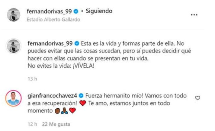 Otro de los jugadores que terminaron sentidos fue el defensor Gianfranco Chávez, y le deseó a Pacheco una pronta recuperación: "Fuerza hermanito mío. Vamos con todo a esa recuperación", le escribió el defensor en Instagram. Asimismo, otro jugador con los que el DT, Roberto Mosquera, no ha podido contar en este inicio de temporada es Martín Távara, aunque este último ya está entrenando con normalidad en La Florida.