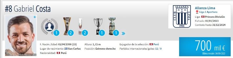 Gabriel Costa está cotizado en el mercado internacional en 700 mil euros así como revela Transfermarkt. Este valor al cambio en soles vendría a ser S/2,8 millones. En este 2023, el también seleccionado peruano ha jugado para los íntimos en 29 ocasiones, convirtiendo en 4 oportunidades y asistiendo 3 veces.
