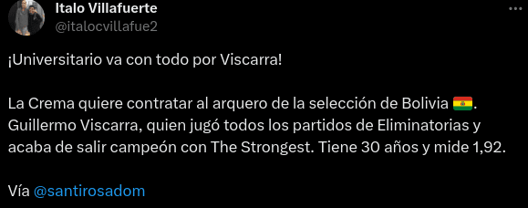 “¡Universitario va con todo por Viscarra! La Crema quiere contratar al arquero de la selección de Bolivia. Guillermo Viscarra, quien jugó todos los partidos de Eliminatorias y acaba de salir campeón con The Strongest. Tiene 30 años y mide 1,92”, se ha podido conocer en la redes sociales, por lo que sería un refuerzo de lujo para el cuadro de Universitario de Deportes, al traer un jugador que está participando en las Eliminatorias.
