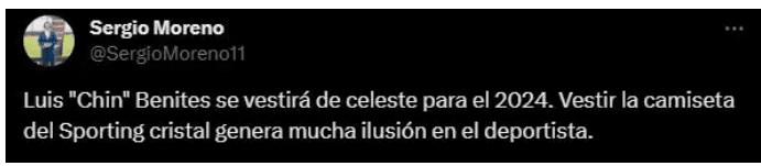 Al parecer desde la directiva rimense no se quieren quedar atrás y tendría un acuerdo con Luis Benites, actual delantero del Sport Huancayo que durante las últimas dos temporadas ha cumplido con muy buenas actuaciones. “Luis Benites se vestirá de celeste para el 2024. Vestir la camiseta de Sporting Cristal genera mucha ilusión en el deportista”; fue relevadora información del periodista deportivo Sergio Moreno a través de su cuenta de twitter en lo que sería una especie de olvidarse del fallido intento de contrato por el atacante colombiano y fichar en su lugar al popular ´Chin´.