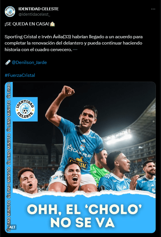 Estamos hablando específicamente de Irven Ávila, quien en las próximas horas se hará oficial su renovación y sorprenderá a propios y extraños. Con tan solo 5 goles y 4 asistencias en toda la temporada no había motivos para que sigan contando con su presencia en el plantel, pero al parecer desde Innova siguen haciendo de las suyas con sus fichajes. “¡Se queda en casa! Sporting Cristal e Irvén Ávila habrían llegado a un acuerdo para completar la renovación del delantero y pueda continuar haciendo historia con el cuadro cervecero”; fue la información brindada hace unos días por el periodista Denilson Barrenechea. Apuesta en Betsson a los partidos de las mejores ligas del mundo y recibe un bono de bienvenida de 50 soles