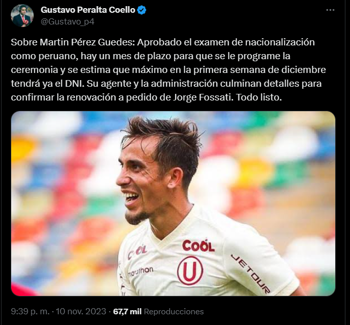 “Sobre Martin Pérez Guedes: Aprobado el examen de nacionalización como peruano, hay un mes de plazo para que se le programe la ceremonia y se estima que máximo en la primera semana de diciembre tendrá ya el DNI. Su agente y la administración culminan detalles para confirmar la renovación a pedido de Jorge Fossati. Todo listo”; fue la más reciente información del periodista deportivo Gustavo Peralta, la cual por cierto viene siendo tendencia en estos momentos en las redes sociales por lo que representa el armado merengue de cara al otro año.