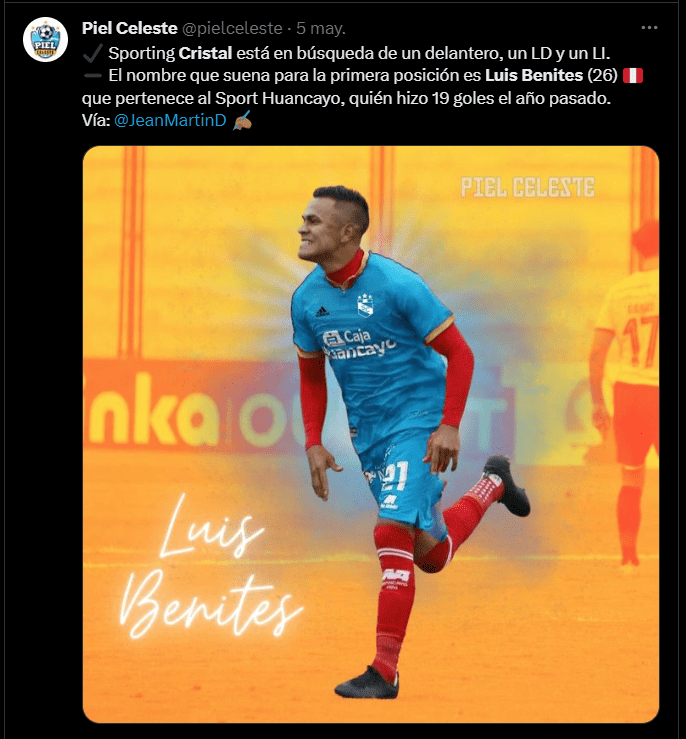 “Sporting Cristal está en búsqueda de un delantero, un lateral derecho y un lateral izquierdo. El nombre que suena para la primera posición es Luis Benites (26) que pertenece al Sport Huancayo, quién hizo 19 goles el año pasado”; es la información compartida por la reconocida cuenta de twitter ´Piel Celeste´ señalando al periodista deportivo Jean Martin Dueñas como la fuente de una bomba noticiosa que viene acaparando los espacios en el ámbito deportivo local al dejar en evidencia que los celestes no quieren perder tiempo de preparación ni de preparación para el próximo campeonato.