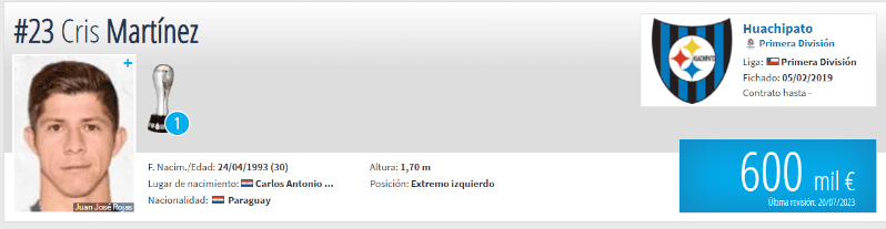 Cris Martínez tiene una cotización internacional de 600 mil euros, lo que en soles daría un aproximado arriba de los 2,8 millones, de acuerdo portal especializado ´Transfermarkt´. Tras un muy buen año y con el reconocimiento de los medios chilenos, el exatacante de Universitario de Deportes ha sabido recomponerse y mostrar su verdadero talento, algo que no supo hacer en Ate, pero que ahora todo el continente destaca su crecimiento en Huachipato.