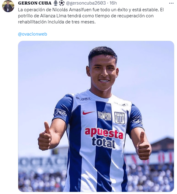 “La operación de Nicolás Amasifuen fue todo un éxito y está estable. El potrillo de Alianza Lima tendrá como tiempo de recuperación con rehabilitación incluida de tres meses", fue lo que dio a conocer el periodista Gerson Cuba, sobre su lesión, con lo cual tendrá que esperar un poco para poder tener la chance de volver a jugar nuevamente, una baja que podría sentirse en Alianza Lima si es que se requiera un lateral izquierdo, pues van a tener que forzar a un central jugar en ese puesto.
