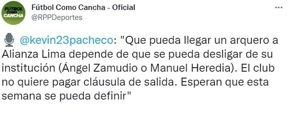 "Que pueda llegar un arquero a Alianza Lima depende de que se pueda desligar de su institución (Ángel Zamudio o Manuel Heredia). El club no quiere pagar cláusula de salida. Esperan que esta semana se pueda definir", dijo el periodista Kevin Pacheco.