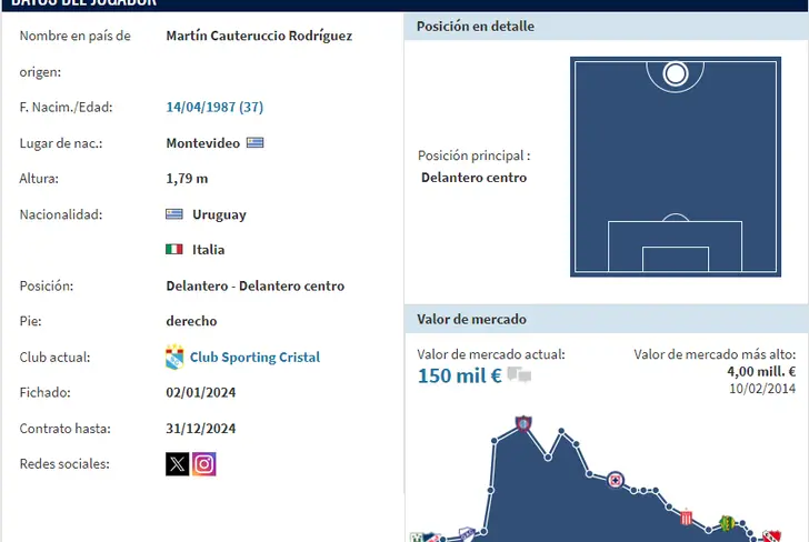 De acuerdo al portal especializado ‘Transfermarkt’, podemos apreciar que Martín Cauteruccio tiene una cotización monetaria de 150 mil euros, lo que en soles daría un promedio cercano a los 600 mil euros. Su mejor valor a lo largo de su carrera deportiva se dio en el año 2014, cuando jugaba en San Lorenzo de Almagro de Argentina gracias a sus 4 millones de euros, lo cual en moneda peruana daría un aproximado de 16 millones. La noticia del momento indica que el goleador charrúa tendría para rato en Sporting Cristal y vaya que los aficionados rimenses serán los más felices al concretarse dicho escenario en las próximas horas.