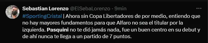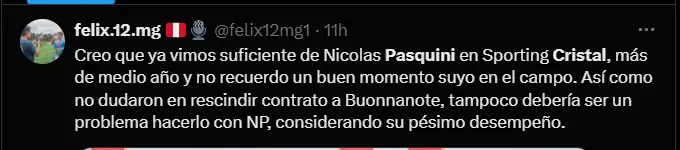 “Creo que ya vimos suficiente de Nicolas Pasquini en Sporting Cristal, más de medio año y no recuerdo un buen momento suyo en el campo. Así como no dudaron en rescindir contrato a Buonnanote, tampoco debería ser un problema hacerlo con NP, considerando su pésimo desempeño”, “Ahora sin Copa Libertadores de por medio, entiendo que no hay mayores fundamentos para que Alfaro no sea el titular por la izquierda. Pasquini no te dió jamás nada, fue un buen centro en su debut y de ahí nunca te llega a un partido de 7 puntos”; son algunos de los comentarios en relación al pésimo nivel del defensor.