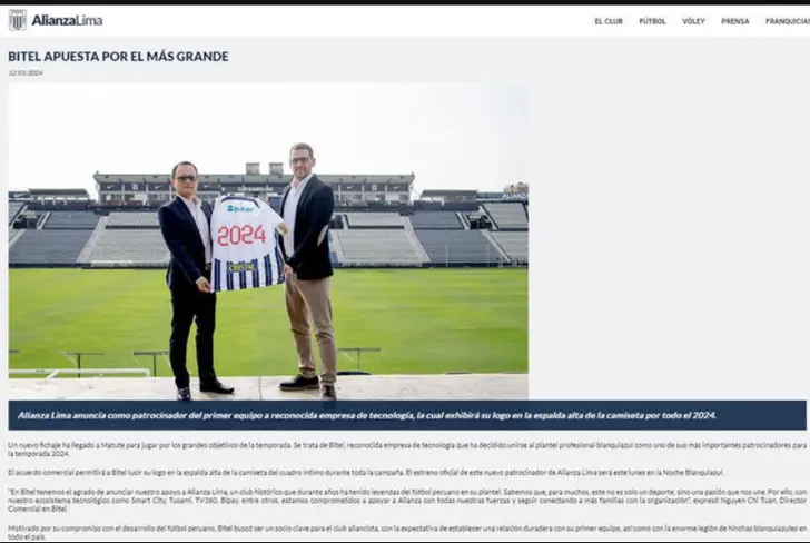 “Un nuevo fichaje ha llegado a Matute para jugar por los grandes objetivos de la temporada. Se trata de Bitel reconocida empresa de tecnología que ha decidido unirse al plantel profesional blanquiazul como uno de sus más importantes patrocinadores para la temporada 2024”; comentó Alianza Lima en su página web oficial en señal de que siempre andan pensando en la innovación y sobre todo en la manera en que la institución puede dar pasos por delante en varios aspectos a diferencia de los clásicos rivales del fútbol peruano.