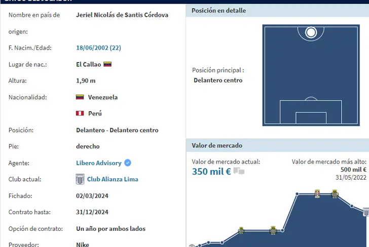 Jeriel De Santis tiene una cotización monetaria en el mercado 350 mil euros, lo cual en soles daría un aproximado cercano a los 1,4 millones, según el portal especializado 'Transfermarkt'. Claramente, la jugada de crecer en todo aspecto vistiendo la camiseta de Alianza Lima no le salió para nada bien y ahora deberá irse por la puerta de atrás de Matute, a pesar de que todavía tiene contrato hasta diciembre de este año 2024, pero la verdad es que ya nadie lo aguanta más.