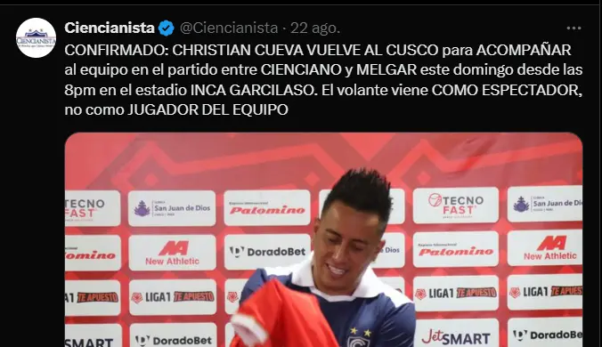 "Confirmado. Christian Cueva vuelve al Cusco para acompañar al equipo en el partido entre Cienciano y Melgar este domingo desde las 8.00 p. en el estadio Inca Garcilaso. El volante viene como espectador, no como jugador del equipo"; fue la reveladora información que compartió la reconocida cuenta de twitter 'Ciencianista' y con la cual viene siendo tendencia en el ámbito deportivo nacional cuando ya todos creían e incluso algunos aseguraban que la relación entre el futbolista y la institución imperial se terminó de romper del todo.