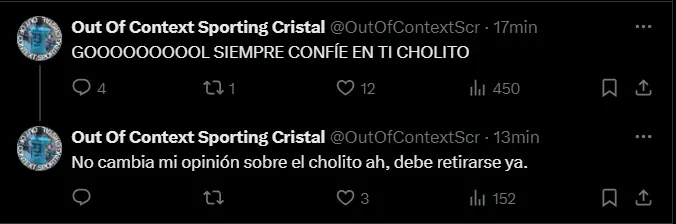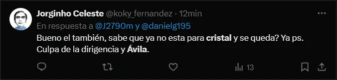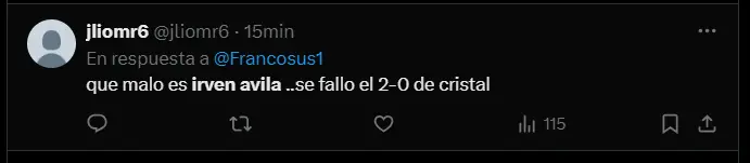 “GOOOOOOOOOL SIEMPRE CONFÍE EN TI CHOLITO. No cambia mi opinión sobre el cholito ah, debe retirarse ya”, “que malo es Irven Avila ..se falló el 2-0 de Cristal” y “Bueno él también, sabe que ya no está para Cristal y se queda? Ya ps. Culpa de la dirigencia y Ávila”; son algunos de los pedidos y comentarios más llamativos de los hinchas rimenses en relación a lo que les viene generando las actuaciones de un Ávila que pese a abrir el marcador el día de hoy no es tan querido que digamos.