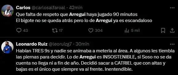 Justamente, Mariano Soso hizo un cambio que al hincha de Alianza Lima no le gustó mucho, que es la inclusión de Adrián Arregui en el once titular, siendo el jugador más criticado por la afición 'blanquiazul', que consideraron que tenerlo en el campo de juego fue tener un jugador menos. Muchos ya están pidiendo su salida del equipo, ya están cansados de verlo dentro del campo, por lo que va a tener que mejorar su rendimiento si quiere demostrar que fue un buen fichaje, ya que al ser extranjero se espera mucho de él, pero no logra contentar a la afición.
