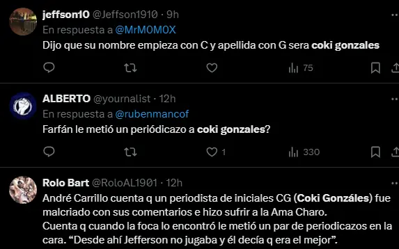 Si se puede ver la data de los periodistas que son conocidos que han cubierto la Selección Peruana, pues en este caso tenemos a Coki Gonzales, de ahí no se conoce a otro con esas mismas siglas, seguramente el comunicador saldrá a hablar del caso en algunos de sus programas, respondiendo si es verdad o no y posiblemente contando su historia en este caso.