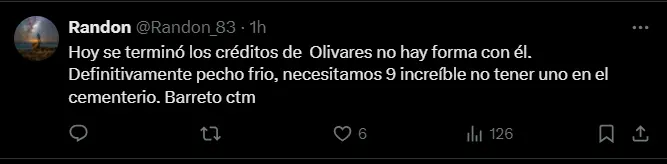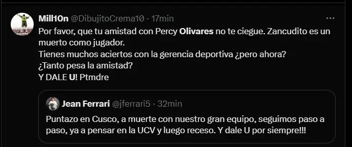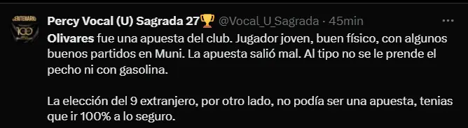 "Hoy se terminó los créditos de Olivares no hay forma con él. Definitivamente pecho frio, necesitamos 9 increíble no tener uno en el cementerio", "Por favor, que tu amistad con Percy Olivares no te ciegue. Zancudito es un muerto como jugador. Tienes muchos aciertos con la gerencia deportiva ¿pero ahora? ¿Tanto pesa la amistad?" y "Olivares fue una apuesta del club. Jugador joven, buen físico, con algunos buenos partidos en Muni. La apuesta salió mal. Al tipo no se le prende el pecho ni con gasolina.La elección del 9 extranjero, por otro lado, no podía ser una apuesta, tenias que ir 100% a lo seguro"; son algunos de los comentarios más llamativos por parte de los hinchas de Universitario de Deportes respecto al rendimiento de Christopher Olivares en el duelo vs Cusco FC.