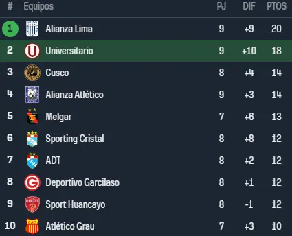 Por el momento Alianza Lima lo vemos en lo más alto de la tabla de posiciones con un total de 20 puntos, esto producto de su victoria ante Chanckas en Andahuaylas que le permite poder seguir siendo el número uno. De cerca, no se despega Universitario de Deportes con 18 unidades, pero que podría perder el lugar si es que Melgar logra ganar los 2 partidos que tiene por jugar, ahí podría cambiar todo y los arequipeños se podrían poner como segundos, así que la pelea por el primer lugar podría ser de 3.