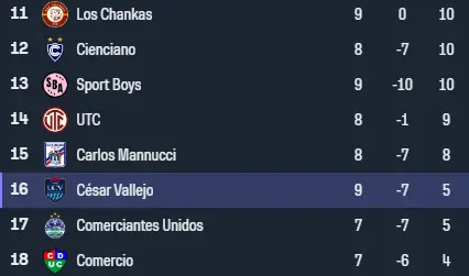 Eso sí, así como la pelea arriba está interesante, la que está por mantener la categoría, también, aunque en este caso en el Torneo Clausura hay varios que se están quedando chicos para el acumulado, el que ya parece sentenciado es Unión Comercio, mientras Carlos A. Mannucci, César Vallejo se van complicando y podrían ser grandes candidatos a irse a la segunda división también.