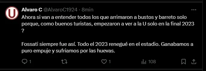 La derrota también despertó viejas heridas en parte de la hinchada, que recordó los cuestionamientos hacia Manuel Barreto y Fabián Bustos. "Ahora sí van a entender todos los que arrimaron a Bustos y Barreto solo porque, como buenos turistas, empezaron a ver a la ‘U’ solo en la final 2023", se leyó en otro comentario viral.