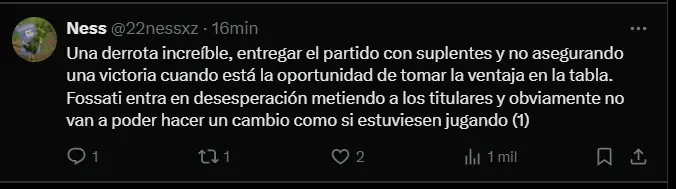 "Una derrota increíble, entregar el partido con suplentes y no asegurando una victoria cuando está la oportunidad de tomar la ventaja en la tabla", escribió un hincha indignado en redes. Además, la reacción tardía del entrenador, al hacer ingresar a los titulares en la segunda parte, fue vista como una medida desesperada y sin claridad táctica.