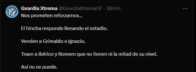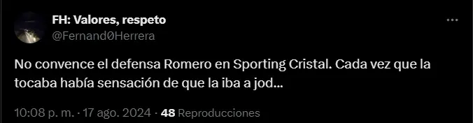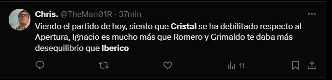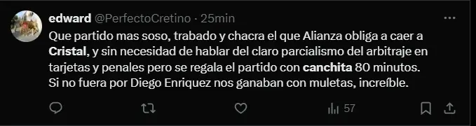 "Nos prometen reforzarnos... El hincha responde llenando el estadio. Venden a Grimaldo e Ignacio. Traen a Ibérico y Romero que no tienen ni la mitad de su nivel. Así no se puede", "Viendo el partido de hoy, siento que Cristal se ha debilitado respecto al Apertura, Ignacio es mucho más que Romero y Grimaldo te daba más desequilibrio que Iberico", "No convence el defensa Romero en Sporting Cristal. Cada vez que la tocaba había sensación de que la iba a jod..." y "Que partido mas soso, trabado y chacra el que Alianza obliga a caer a Cristal, y sin necesidad de hablar del claro parcialismo del arbitraje en tarjetas y penales pero se regala el partido con canchita 80 minutos. Si no fuera por Diego Enríquez nos ganaban con muletas, increíble"; son algunas de las reacciones más llamativas de los hinchas de Sporting Cristal tras el 0-0 ante Alianza Lima.