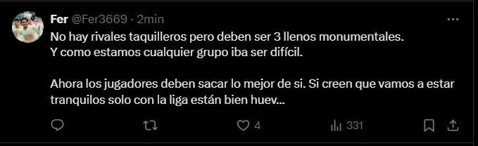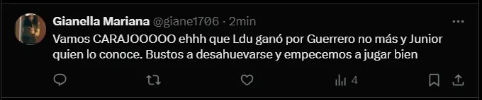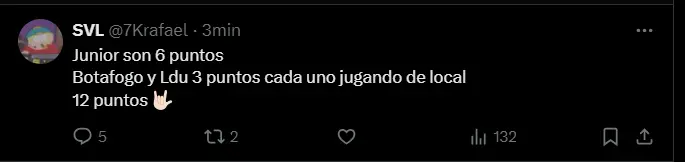 "No hay rivales taquilleros pero deben ser 3 llenos monumentales. Y como estamos cualquier grupo iba ser difícil. Ahora los jugadores deben sacar lo mejor de si. Si creen que vamos a estar tranquilos solo con la liga están bien huev...", "Vamos cremas! Nunca fue fácil para nosotros!", "Junior son 6 puntos Botafogo y Ldu 3 puntos cada uno jugando de local 12 puntos" y "Vamos CARAJOOOOO ehhh que Ldu ganó por Guerrero no más y Junior quien lo conoce. Bustos a desahuevarse y empecemos a jugar bien"; son algunas de las reacciones más llamativas de los hinchas cremas.