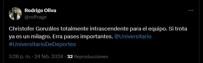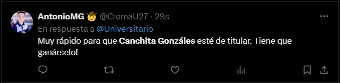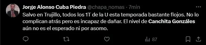 “Christofer Gonzáles totalmente intrascendente para el equipo. Si trota ya es un milagro. Erra pases importantes”, “Muy rápido para que Canchita Gonzáles esté de titular. ¡Tiene que ganárselo!”, “Salvo en Trujillo, todos los 1T de la U esta temporada son bastante flojos. No lo complican atrás pero es incapaz de dañar. El nivel de Canchita Gonzáles aún no es el esperado ni por asomo”; son algunas de las reacciones más llamativas de los aficionados cremas en cuestionamiento al nivel mostrado por Christofer Gonzáles.