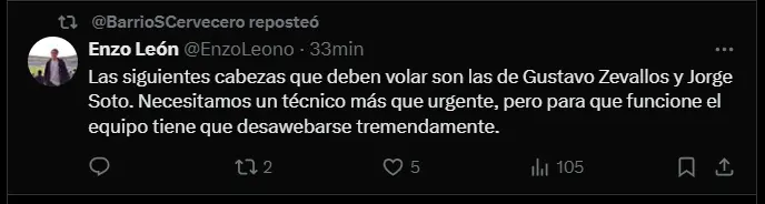 Mensajes como “Las siguientes cabezas que deben volar son las de Gustavo Zevallos y Jorge Soto. Necesitamos un técnico más que urgente, pero para que funcione el equipo tiene que desahuevarse tremendamente”, resumen el sentir de miles de aficionados que, hartos de ver al club sin rumbo claro, reclaman cambios profundos en la estructura deportiva. Para ellos, mantener a Soto en el banquillo y a Zevallos como encargado del proyecto es prolongar una crisis que ya se siente insostenible.