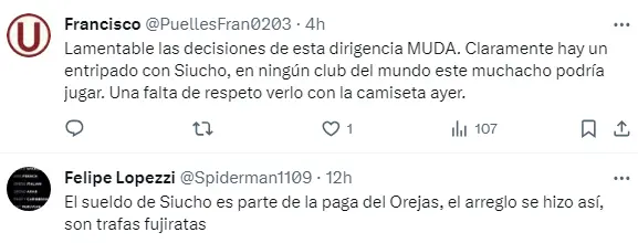 Los hinchas piden la salida inmediata de Roberto Siucho, pero al tener contrato vigente con Universitario de Deportes seguirá en el club, algo que a muchos sorprende, pues piden que sea prestado o que simplemente busquen que se finiquite su contrato para que sobre todo, no ocupe cupo en los 25 que tendrán esta temporada.