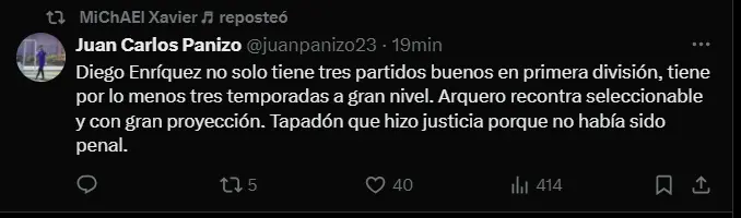 Con un puntaje promedio de 7.5, según el portal especializado 'Sofascore', Diego Enríquez la hizo bien en el Sporting Cristal vs Alianza Lima y los comentarios en redes sociales también lo posicionan como una posibilidad de ser parte de la Selección Peruana. "Diego Enríquez no solo tiene tres partidos buenos en primera división, tiene por lo menos tres temporadas a gran nivel. Arquero muy seleccionable y con gran proyección. Tapadón que hizo justicia porque no había sido penal"; se puede apreciar en el análisis del reconocido comunicador deportivo Juan Carlos Panizo.