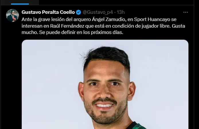 “Ante la grave lesión del arquero Ángel Zamudio, en Sport Huancayo se interesan en Raúl Fernández que está en condición de jugador libre. Gusta mucho. Se puede definir en los próximos días”; fue la más reciente y reveladora información que compartió el comunicador deportivo Gustavo Peralta a través de twitter en señal de que el experimentado guardameta nacional podría continuar con su carrera en el ´Rojo Matador´.
